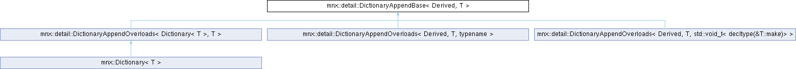 Inheritance diagram for mnx::detail::DictionaryAppendBase< Derived, T >:Public Member Functions | |